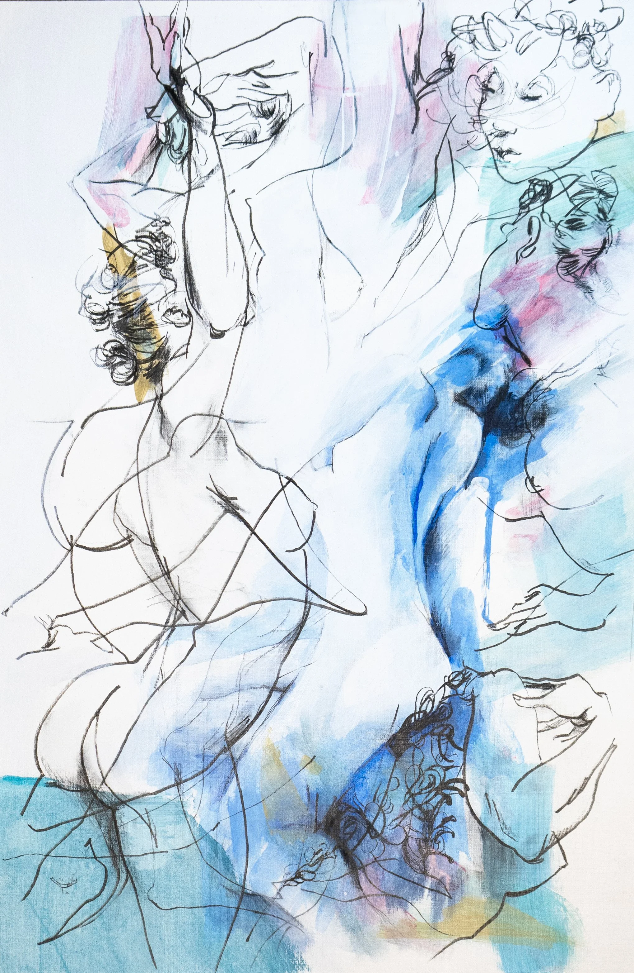 The figures emerge from the canvas, their outlines delicate yet defined, creating a sense of movement and fluidity. The color palette bursts with irregular swathes layered and intermingled to create depth and asymmetry. The relationship between the body sketches and the surrounding colors evokes a tangible connection to feelings.