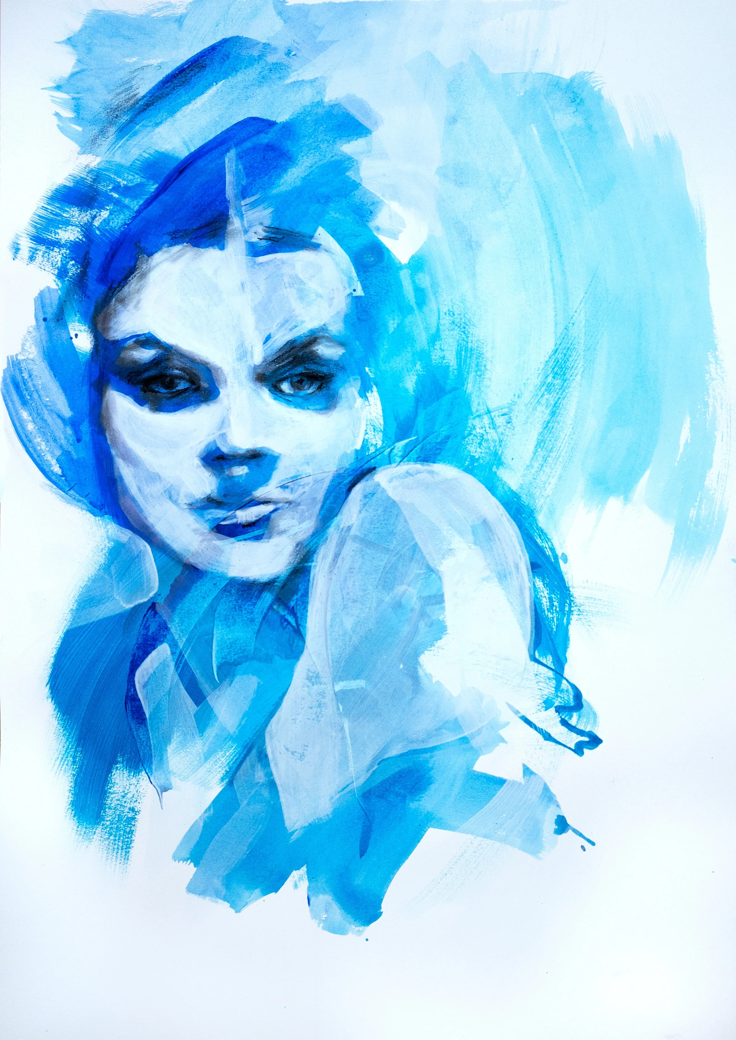 Woman with an alluring and curious expression that attracts attention. Her large, expressive eyes invite viewers to explore her thoughts. Soft charcoal lines shape her face, contrasting with bold blue brushstrokes around her. These vibrant blue strokes suggest movement and depth while evoking emotion. This contrast highlights her sultry charm and curiosity.