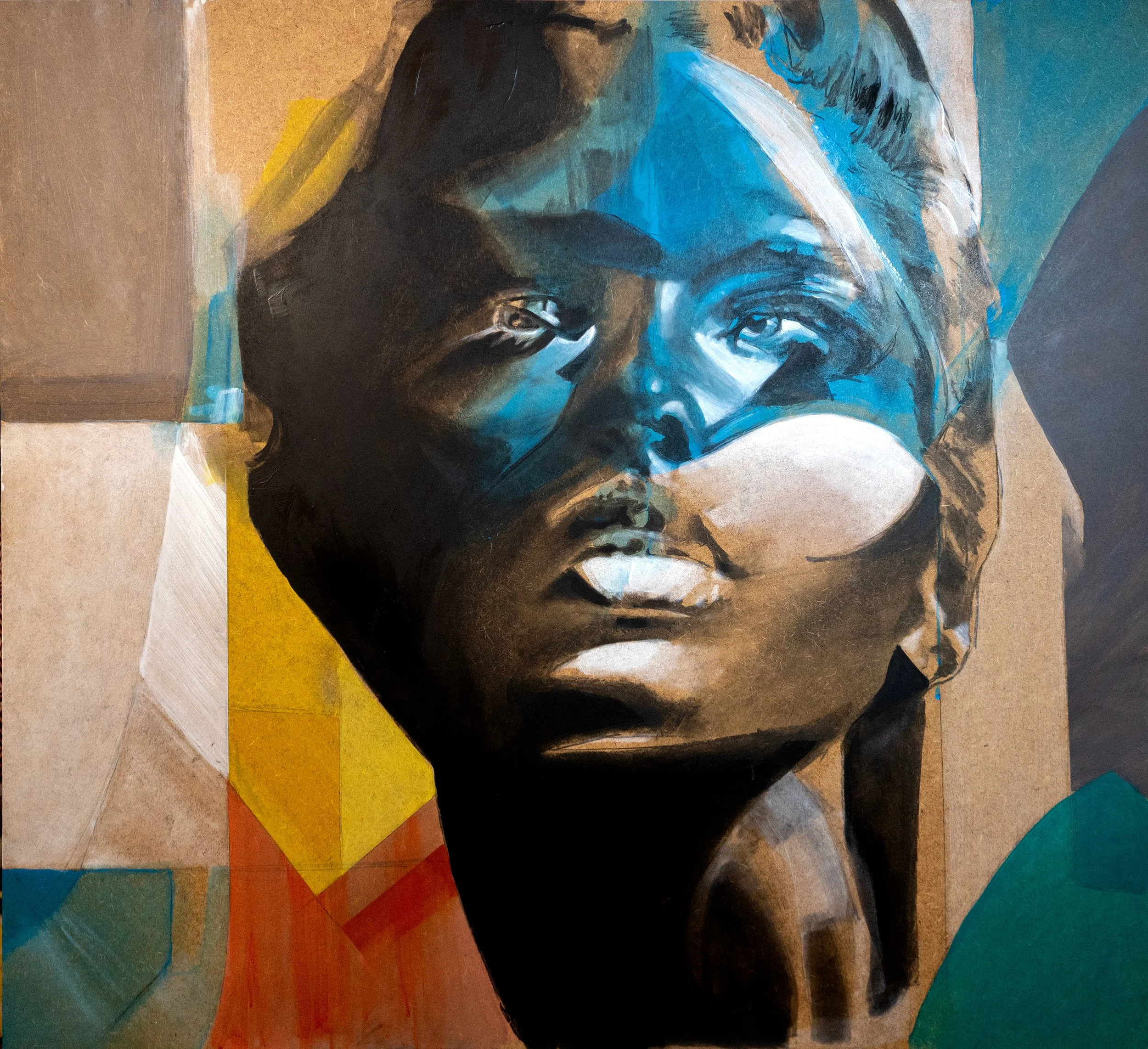 Skillfully blending bold, geometric forms with lifelike detail, the subject's expression is both fragmented and cohesive, challenging traditional notions of representation and inviting deeper contemplation on identity and perception.