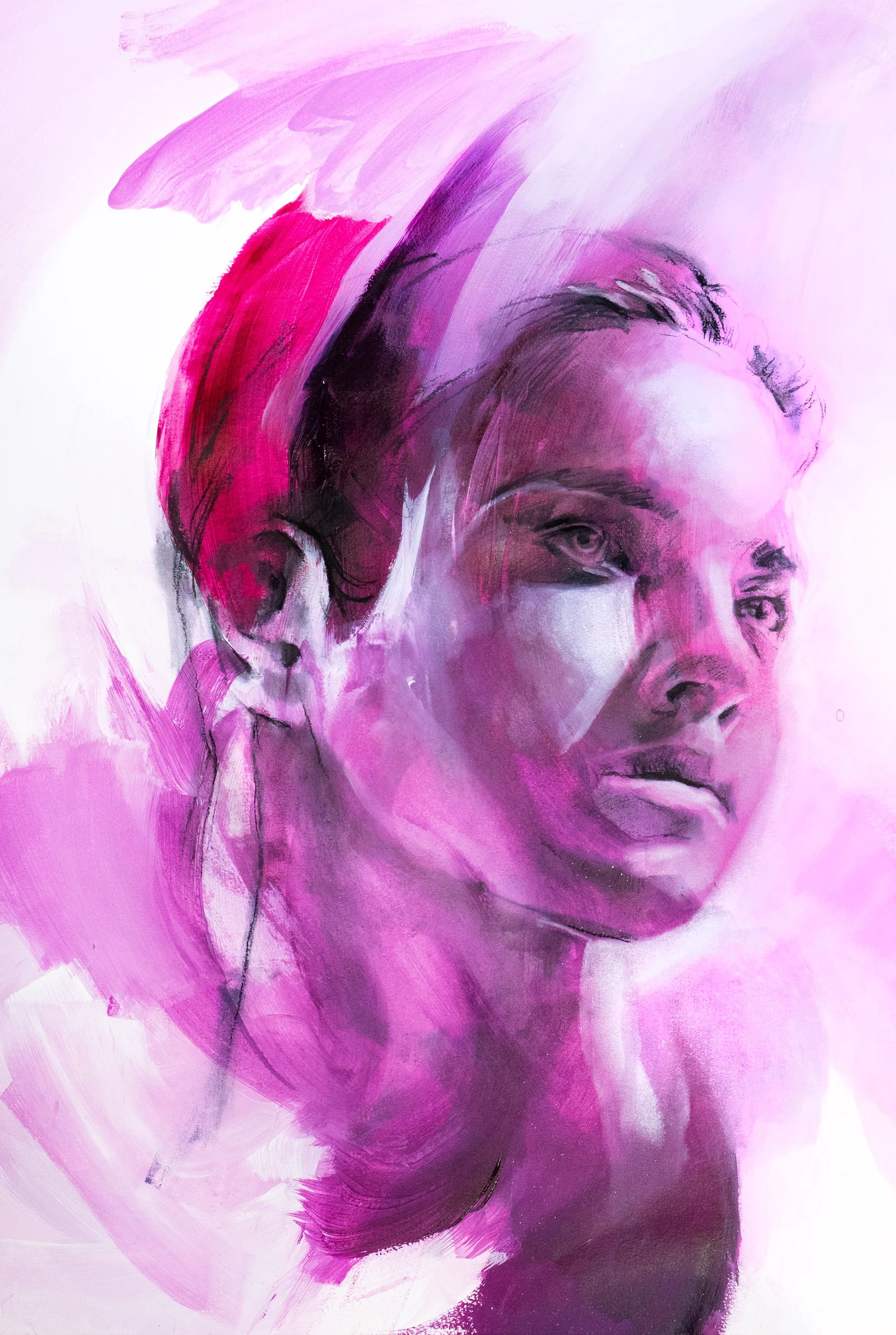 Brushstrokes swirl in a blend of pink hues, aiding the dynamic balance and evoking a sense of movement, as if the background pulsates with emotion. The pink tones subtly influence the overall mood, suggesting warmth and tenderness, while the abstract nature of the brushwork adds an element of intrigue. The combination of realism and abstraction invites contemplation, encouraging the viewer to ponder the thoughts behind the subject's passive demeanor.