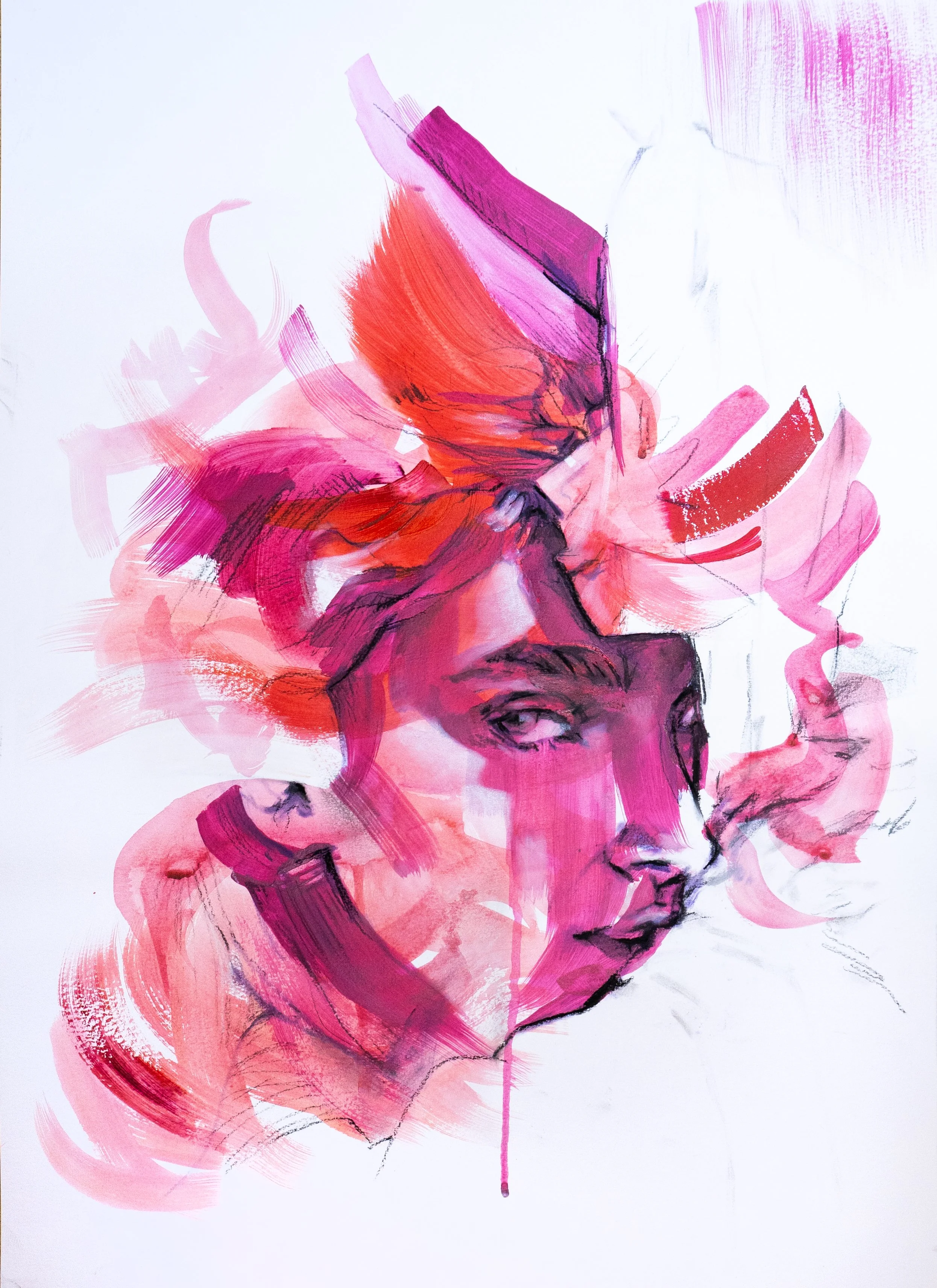 Abstracted portrait surrounded by a rich and expansive backdrop of deep reds, where the charcoal lines both soften and simultaneously define the features in a manner that adds to the intrigue, or taunting seduction, expressed in the eyes. The dynamic and fluid brushstrokes flow throughout the entirety of the piece, generating a palpable wave of emotional tension, or delight.